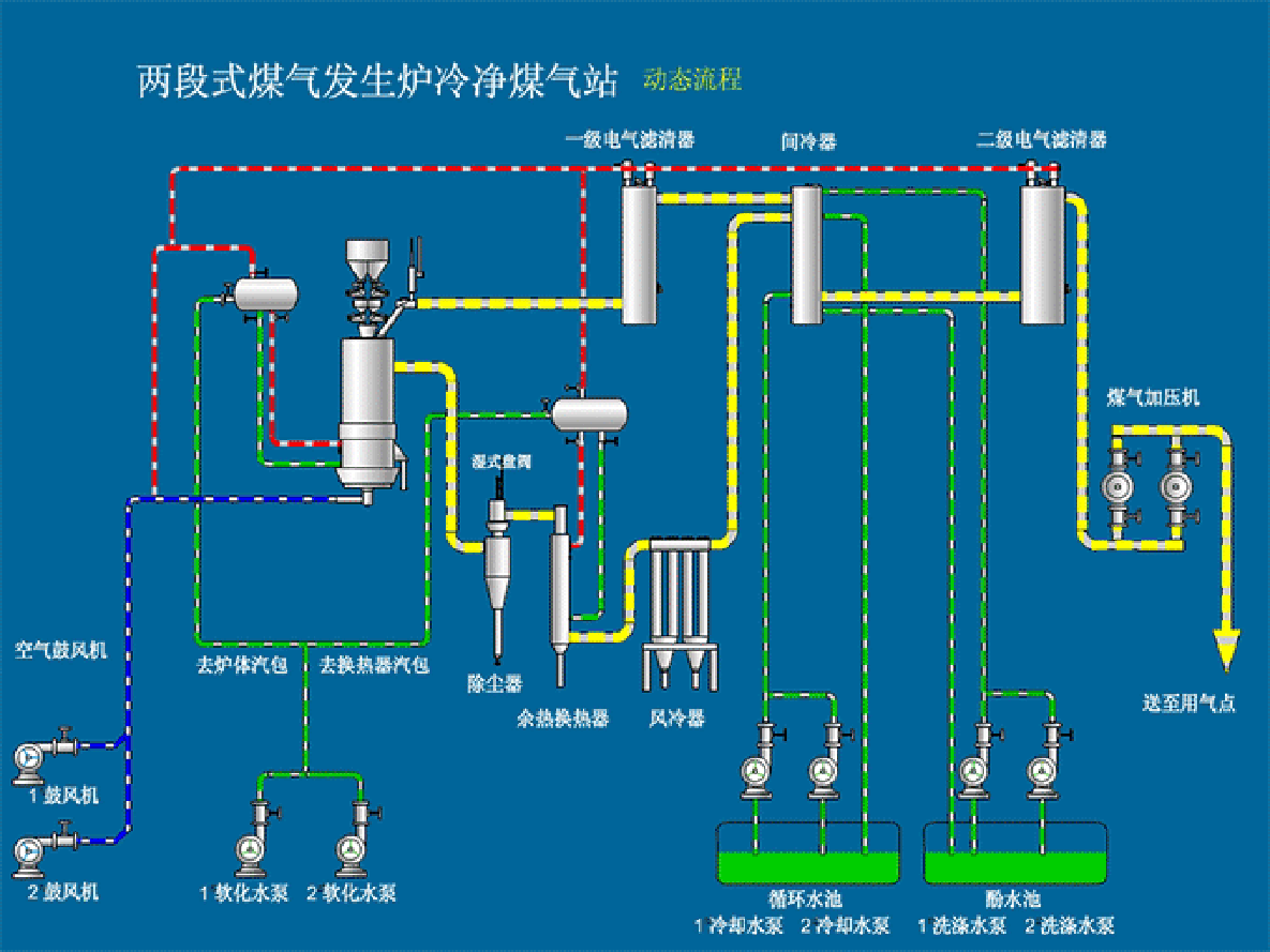 双段煤气发生炉煤气发生炉为连续制气的全水套结构,来自鼓风机的空气与炉体自产0.29MPa的蒸汽混合成饱和空气作为气化剂,经止回阀通过煤气炉底部进入煤气炉内;